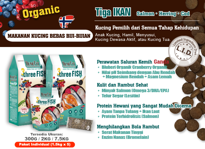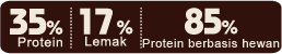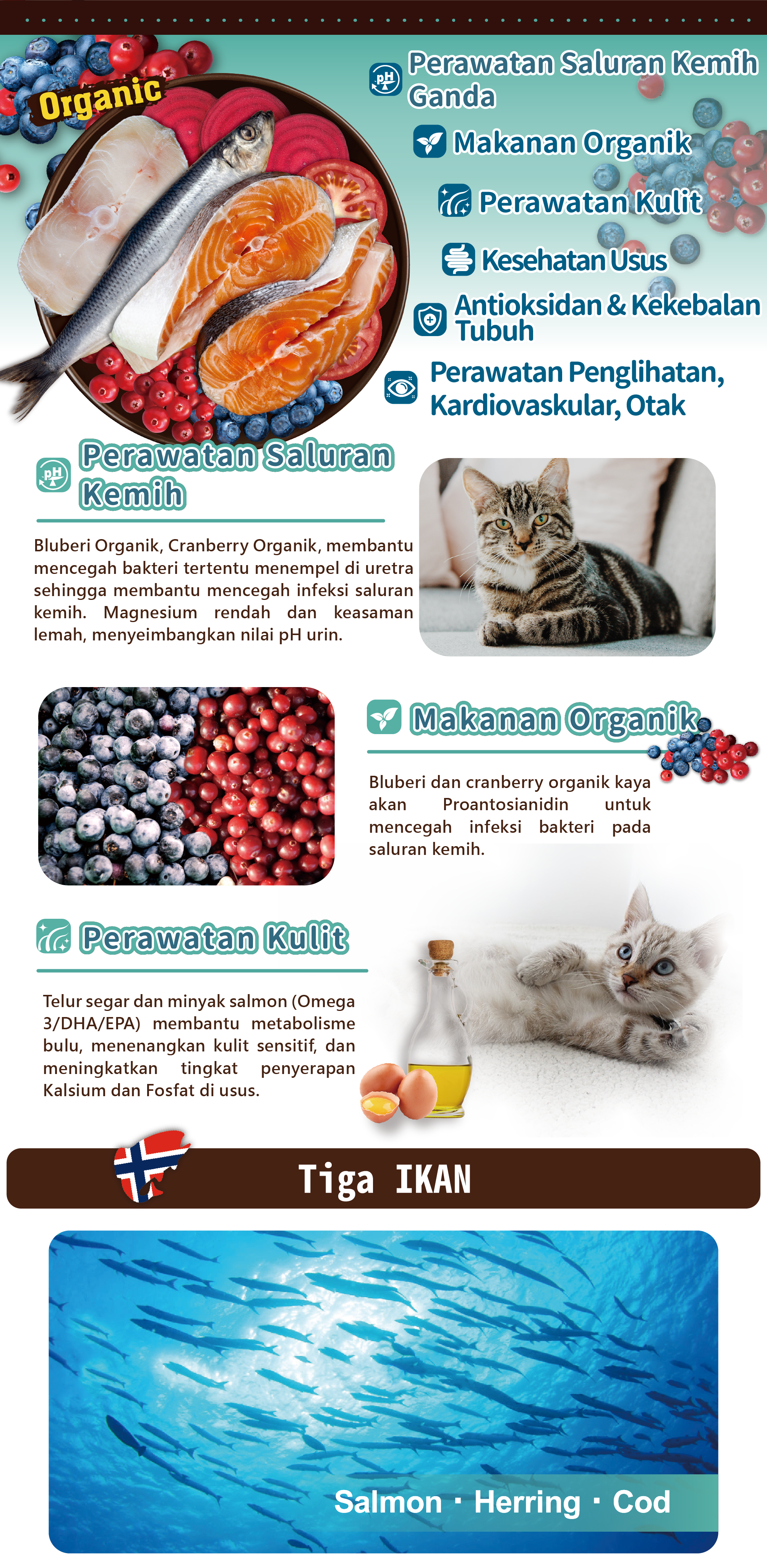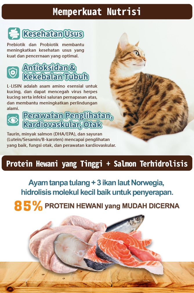 Ayam Tanpa Tulang (Sumber Kondroitin), Ikan Laut (Salmon/Herring/Cod), Singkong, Kacang Polong, Lemak Ayam (SFA, Sumber Omega9&6), Protein Terhidrolisis (Salmon), Sayuran dan Buah-buahan (Bit, Wijen, Bluberi Organik, Cranberry Organik, Daun Ubi Jalar, Tomat, Wortel), Minyak Kanola (Omega6/LA/ALA), Minyak Salmon (Omega3/ALA/DHA/EPA/AA Sumber), Asam Amino (L-Lisina, DL Metionin, Taurin), Telur Segar (Lesitin), Mineral Esensial (Kalsium, Fosfor, Kalium, Natrium, Zat Besi, Seng, Tembaga, Mangan, Selenium), Berbagai Vitamin (Koloni Klorida, Vitamin A, B1, B2, B3, B5, B6, B9, B12, C, E, D3, H), Prebiotik (FOS, MOS), Ekstrak Yucca Schidigera, Probiotik (Bacillus Subtilis, Lactobacillus Plantarum), Glukosamin, Enzim Nanas (Bromelain), Antioksidan Alami.