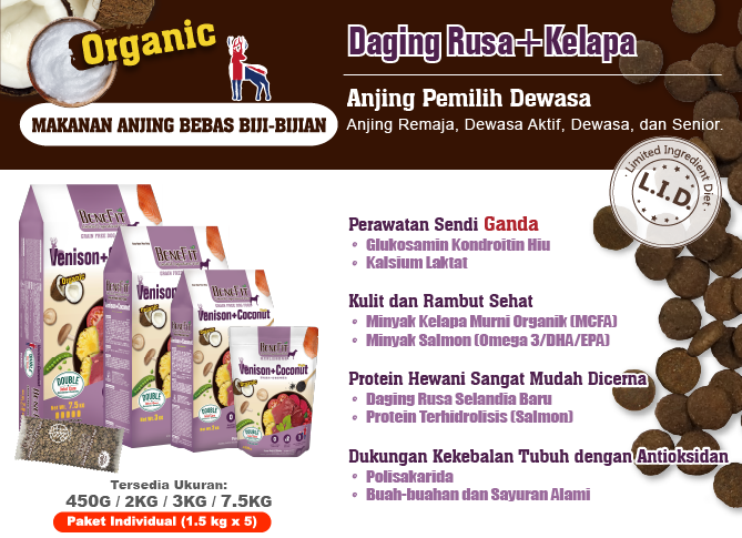 Daging Dehidrasi (Daging Rusa, Sumber Kondroitin), Singkong, Kacang Polong, Sayuran dan Buah-buahan (Bit, Wijen, Apel, Cranberry, Daun Ubi Jalar, Tomat, Wortel, Brokoli), Lemak Ayam (SFA, Sumber Omega9&6/LA/ALA), Minyak Kanola (Sumber Omega6/LA/ALA), Minyak Salmon (Sumber Omega3/ALA/DHA/EPA/AA), Protein Terhidrolisis (Salmon), Asam Amino (L-Lisina, DL Metionin, Taurin), Minyak Kelapa Murni Organik (MCFA), Mineral Esensial (Kalsium, Fosfor, Kalium, Natrium, Zat Besi, Seng, Tembaga, Mangan, Selenium), Kalsium Laktat, Berbagai Vitamin (Koloni Klorida, Vitamin A, B1, B2, B3, B5, B6, B9, B12, C, E, D3, H), Prebiotik (FOS), Ekstrak Yucca Schidigera, Probiotik (Bacillus Subtilis), Enzim Nanas (Bromelain), Glukosamin, Kondroitin Hiu, Polisakarida, Antioksidan Alami.